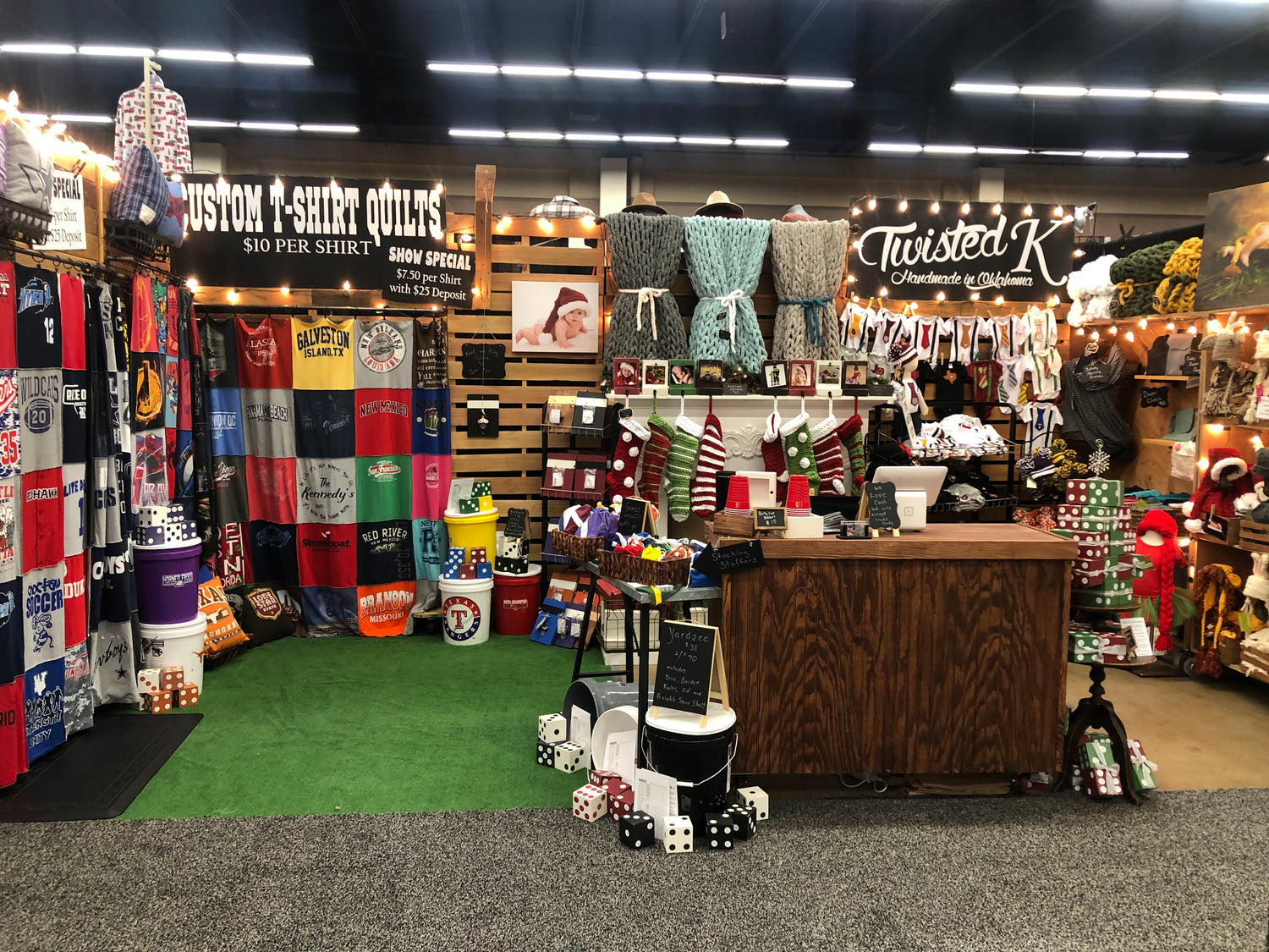 T-shirt Quilts, Texas Themed Onesies and Hand Burnt Hats are available in our first Bookshelf Location