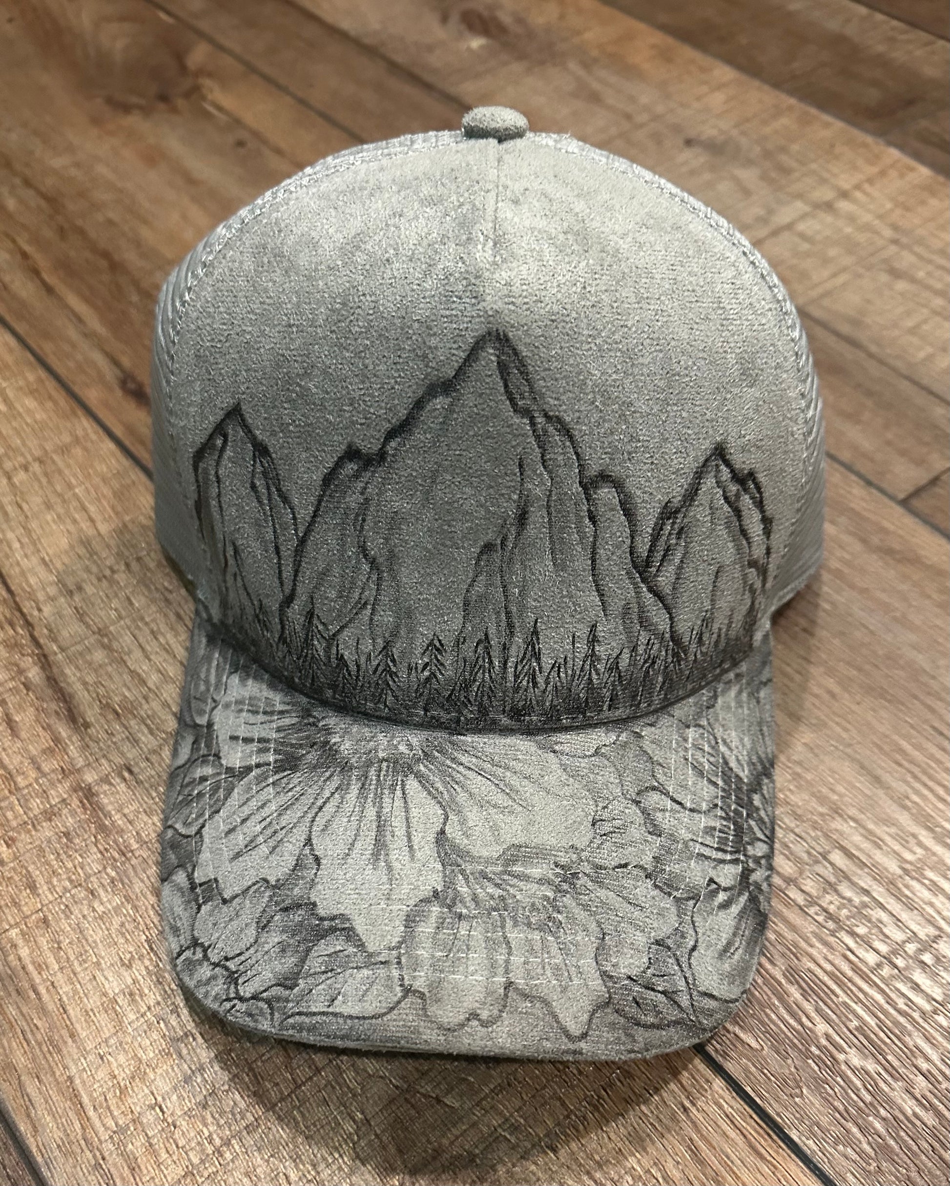 Wide Brim- the design goes up the side of the crown. The pattern includes the designs for the whole hat- top of the brim, under the brim, side of the crown and the top of the crown. The mountains go all the way around the crown.