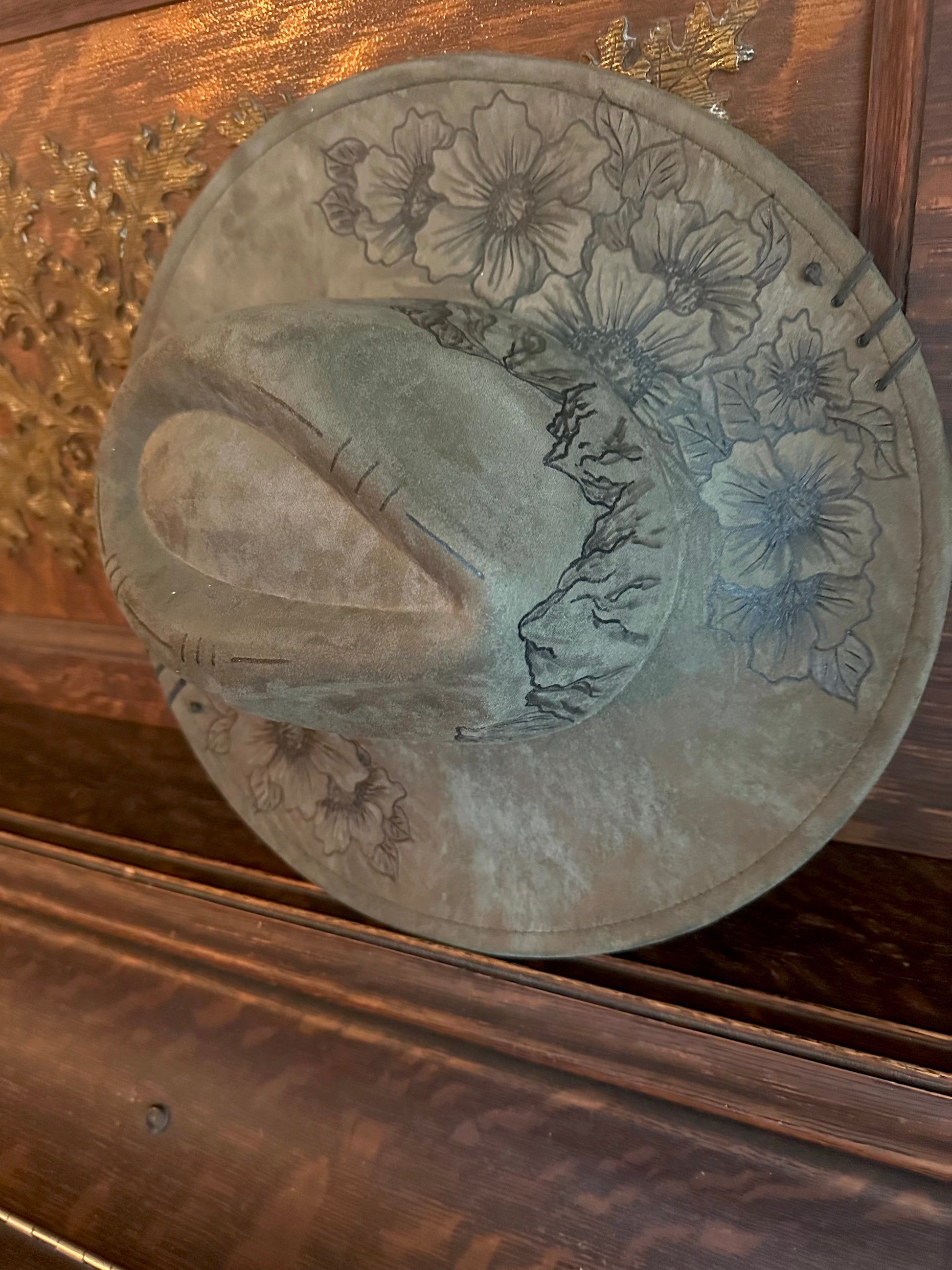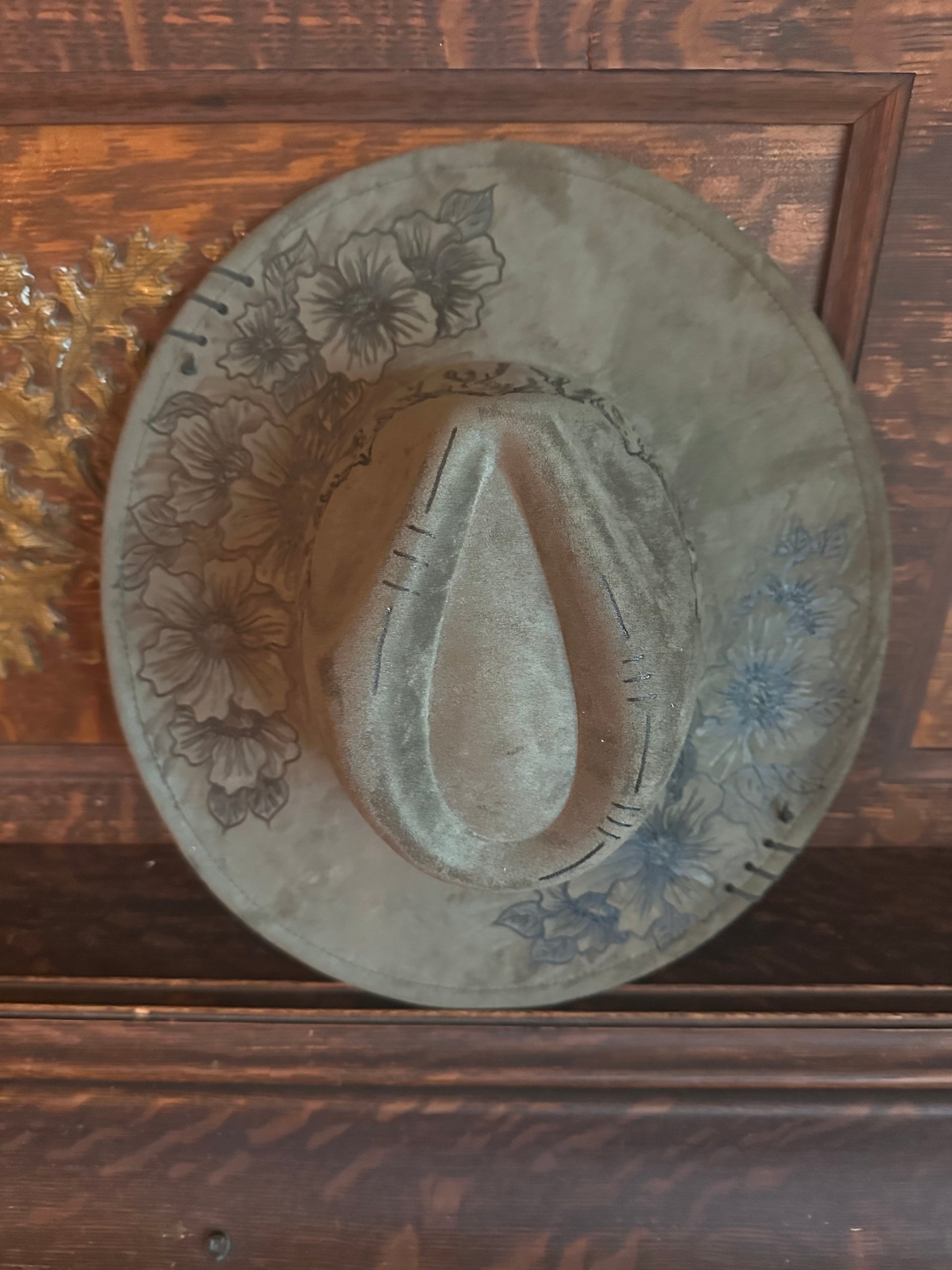 We strive to give an accurate pattern, please test the pattern on the hat before transferring. Hats are not all the same size, even when ordered from the same company at the same time, they have variations. Some adjusting of the pattern to the hat may be required. Our hats are Vegan Suede approximately 15.5" Long x 14.5" Wide with a 3.5" Brim. Teardrop Creased Crown with Side Dents.